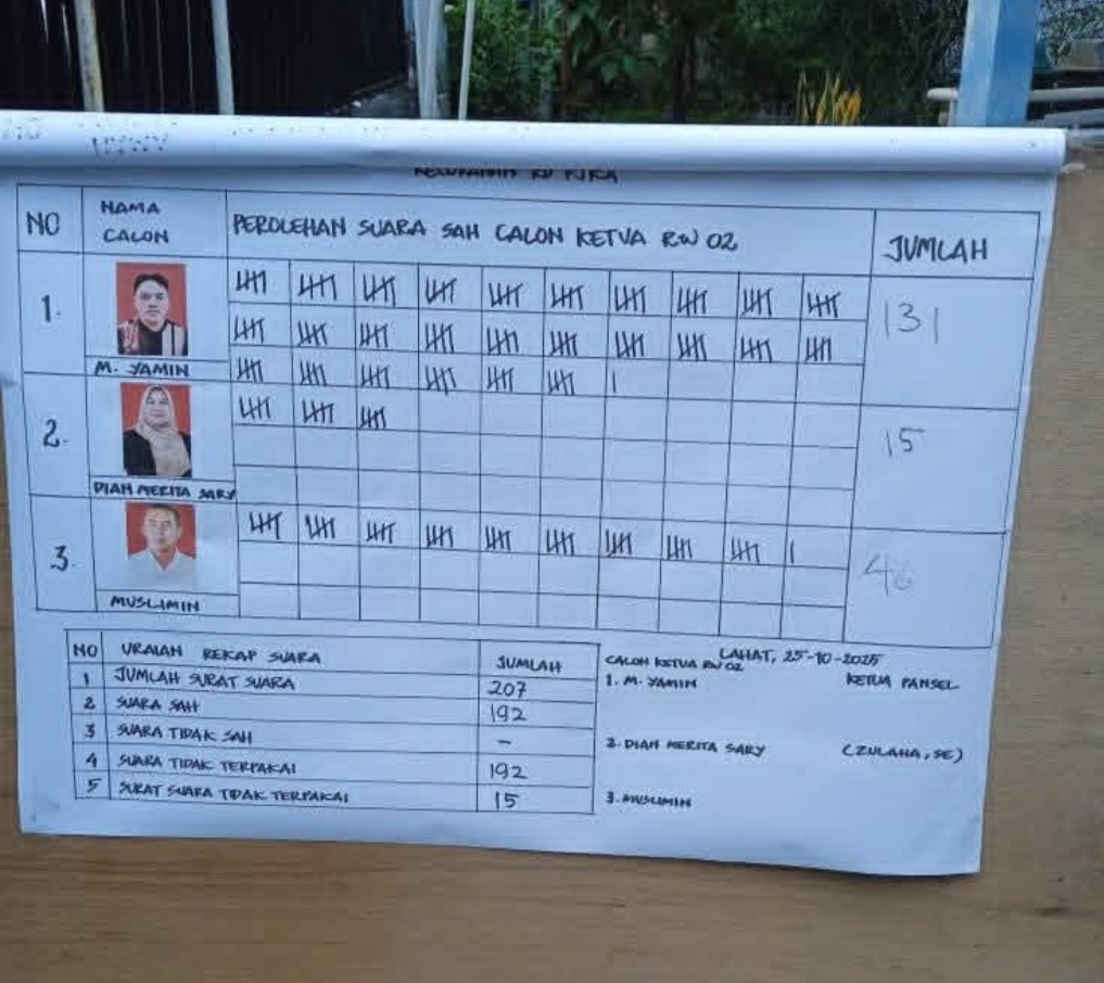 pemilihan Ketua RW 02 RT 05 kelurahan Rdpjka Lahat di ikuti sebanyak 207 warga yang memiliki hak suara M. yamin terpilh sebagai ketua RW 02 RT 05 Kelurahan Rdpjka Lahat dengan jumlah suara sebanyak 131.